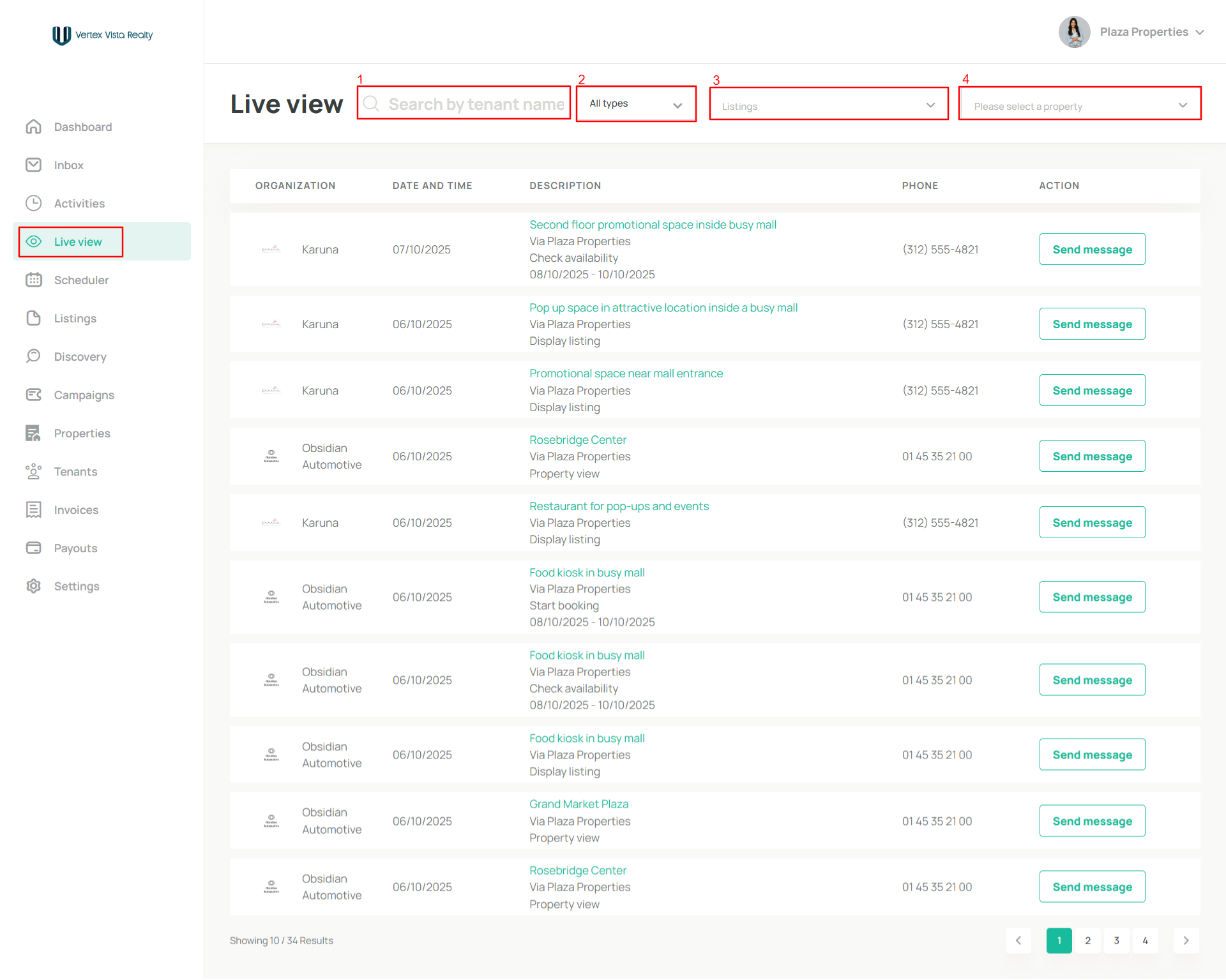 | 4 | Please select a property | Enables users to filter results based on a specific property. When a property is selected, only activities related to that property are displayed in the Live View table. |